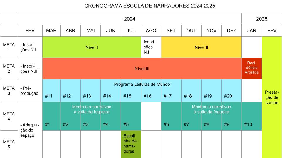 - Escola de Narradores (Formação, difusão, pesquisa e residências artísticas com Mestres Tradicionais, artistas, escritores e narradores orais)