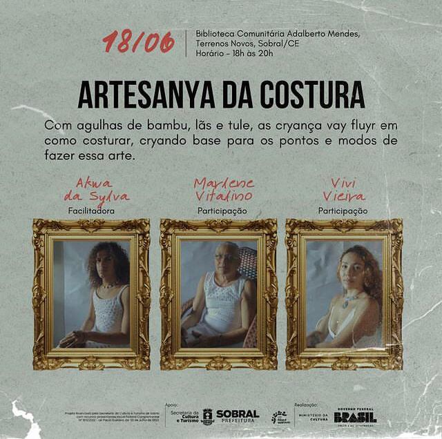 Vivi Vieira é artista sobralense nas multilinguagens da moda que realiza trabalhos pessoais e coletivos na cidade desde o ano de 2021 na direção,desing e costuras do ateliê Hayá e brechó garimpuda. Também atua como assistente de produção,stylist e oficineira. Vivi tem como principal característica a expressão das vivências que transmitam autenticidade através da moda cosciente.