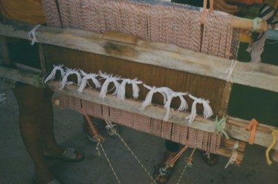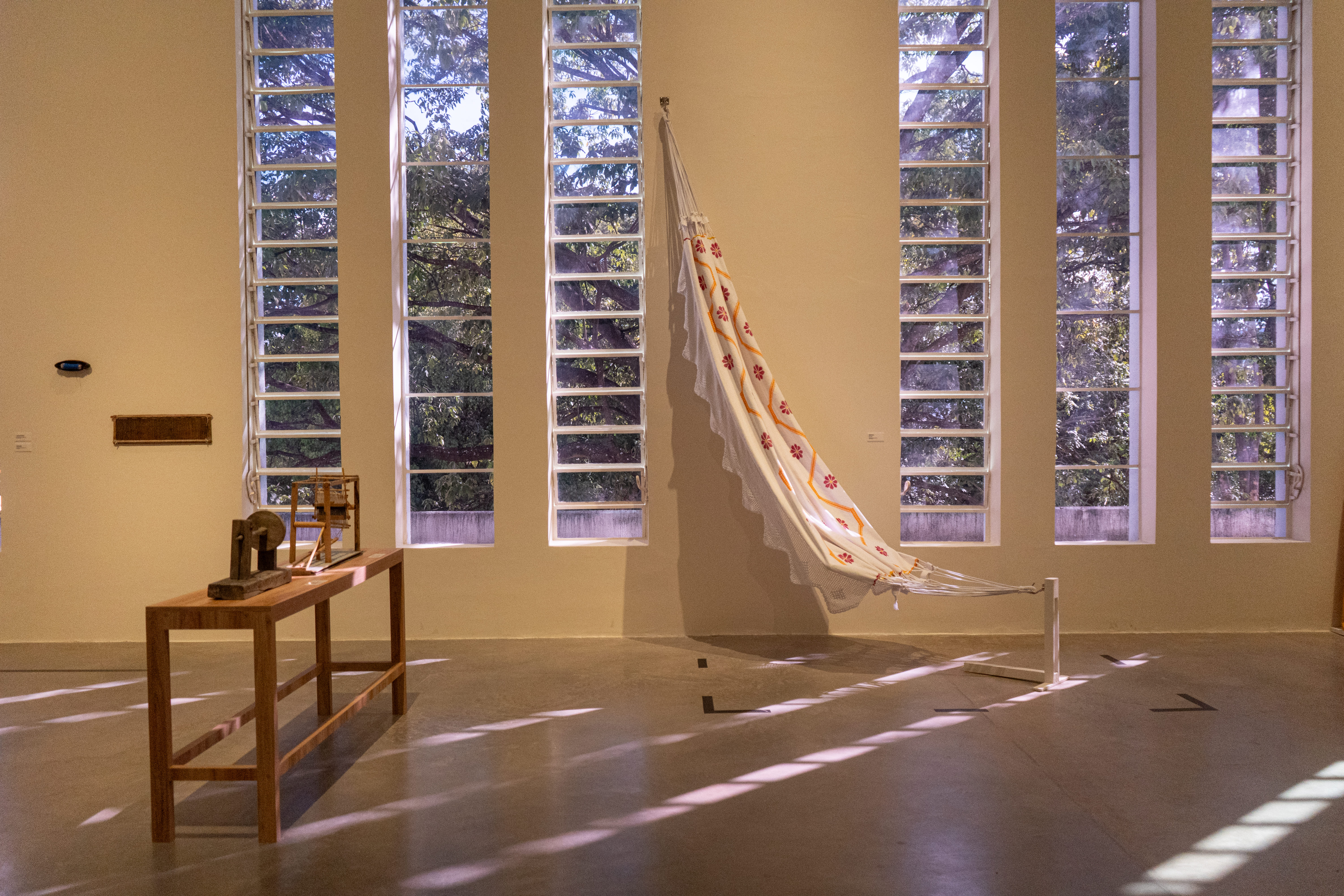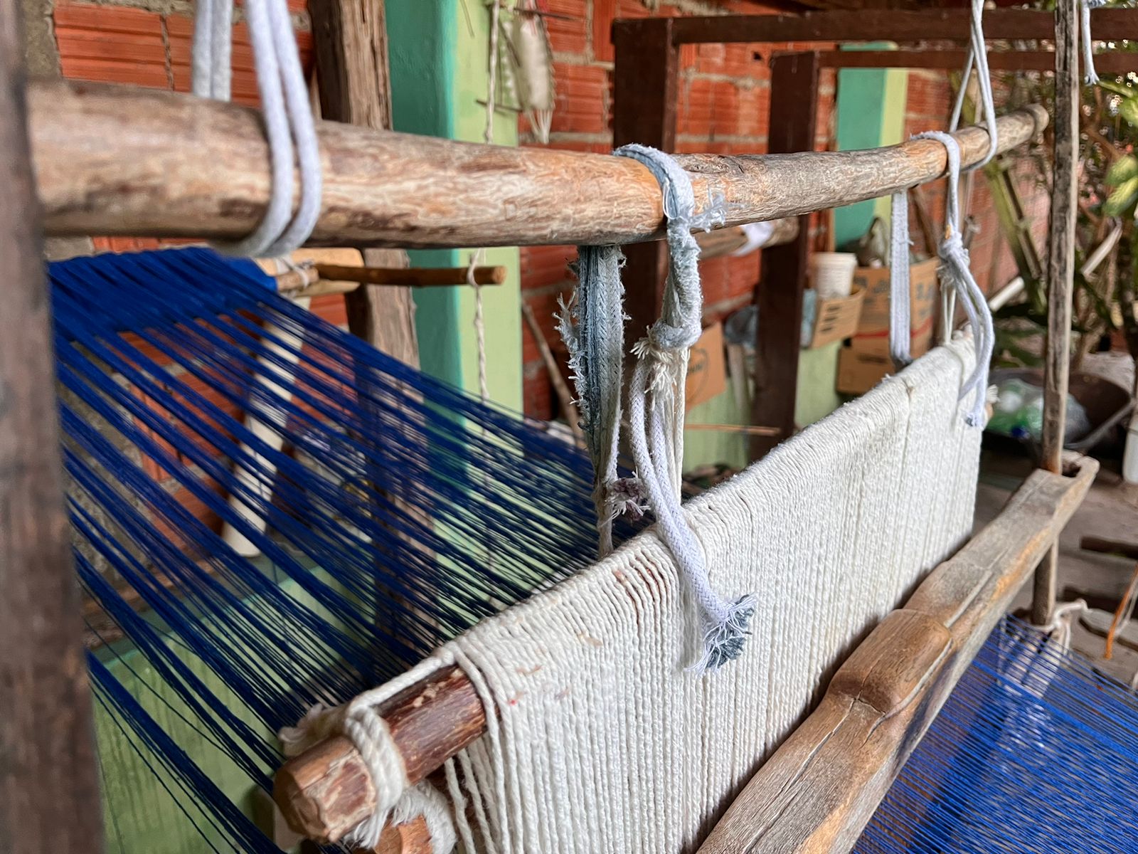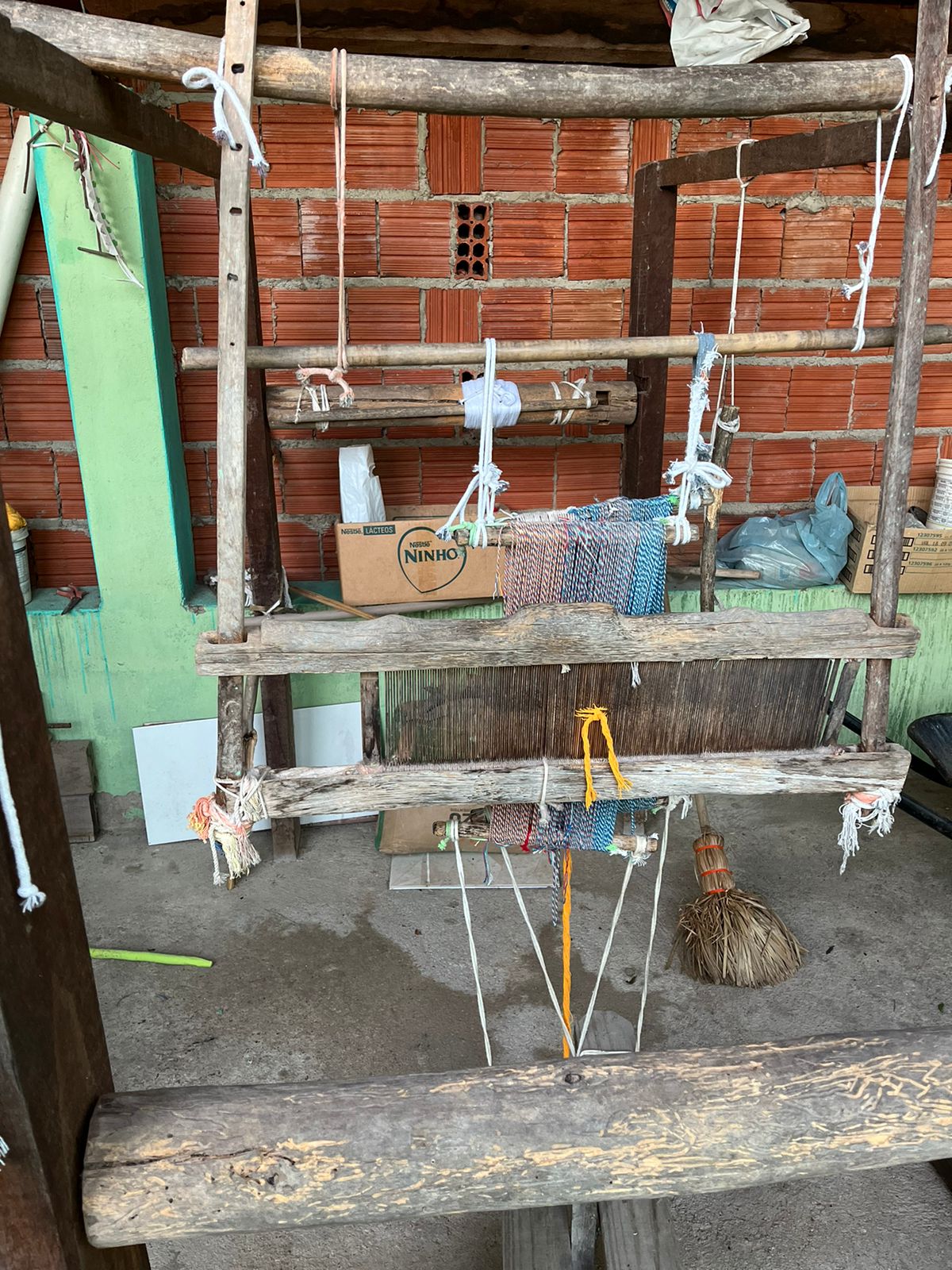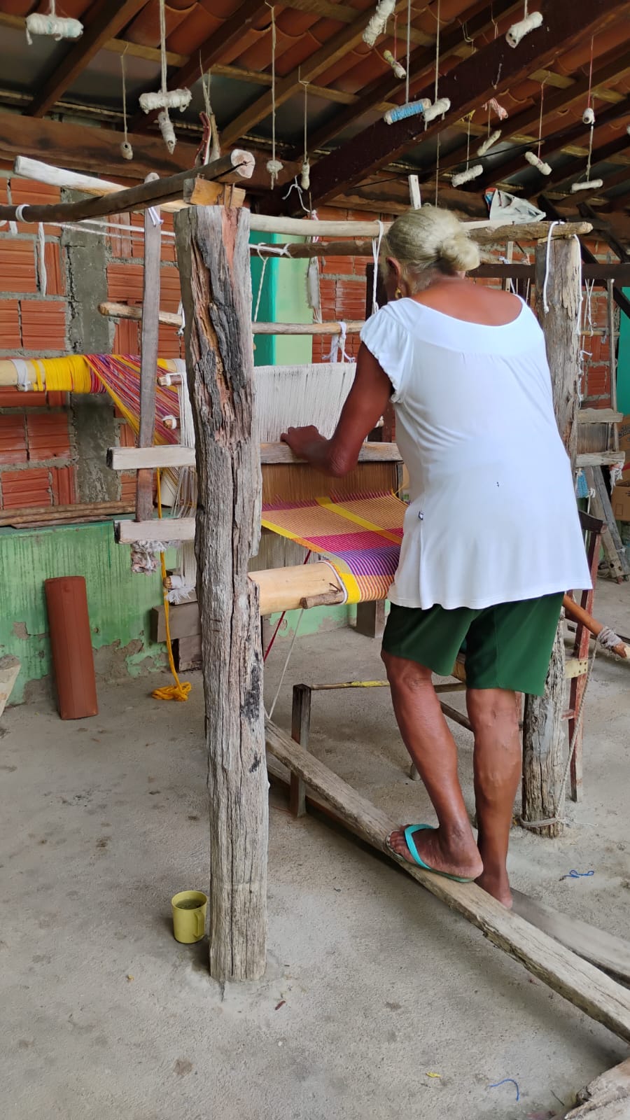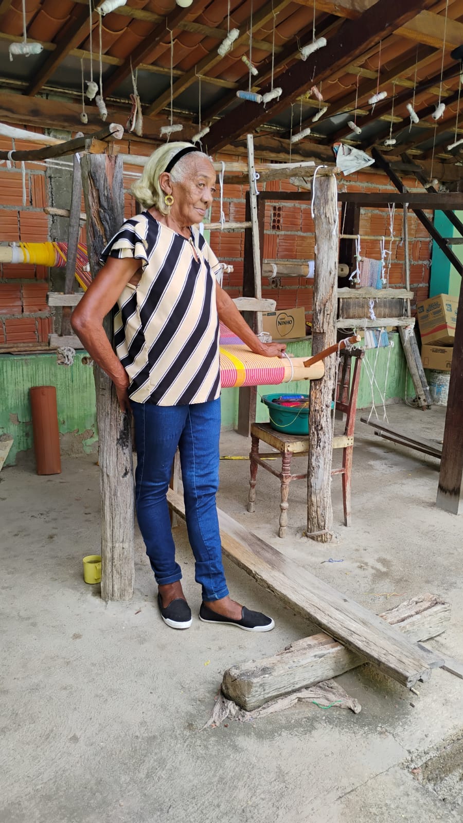 No quintal, repousam as partes do tear que tanto contribuíram para sua arte: liço, queixa, braço, orgo, pente, rasteira, cartel, canela e lançadeira. Com carinho e espontaneidade, Dinha brinca, afirmando que as madeiras de Ipê e Peroba Rosa que as compõem são mais antigas que suas próprias lembranças.