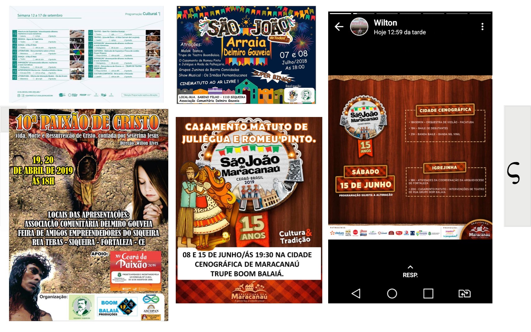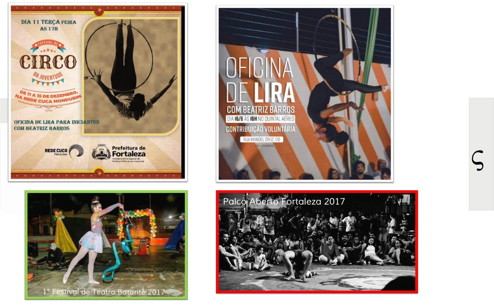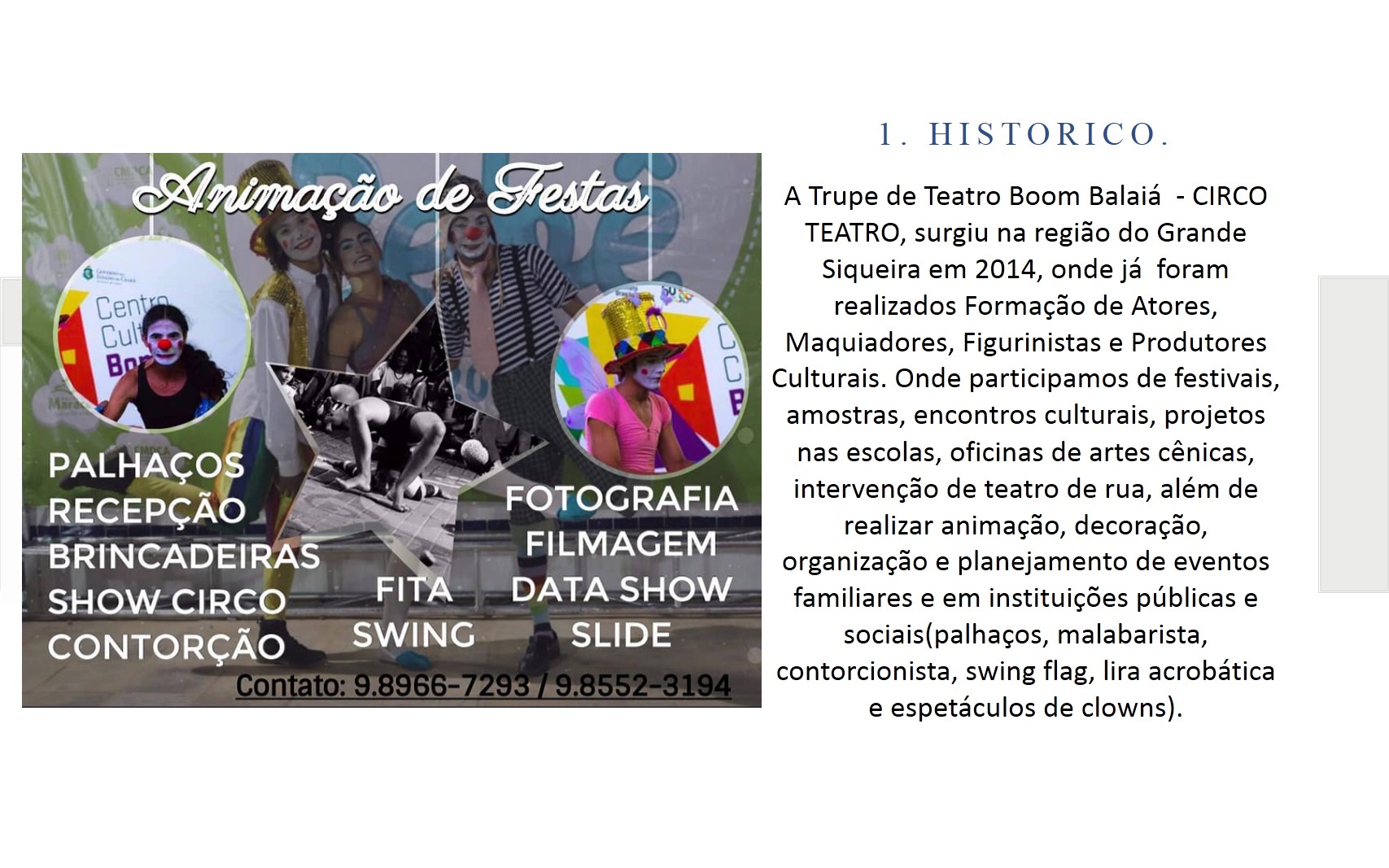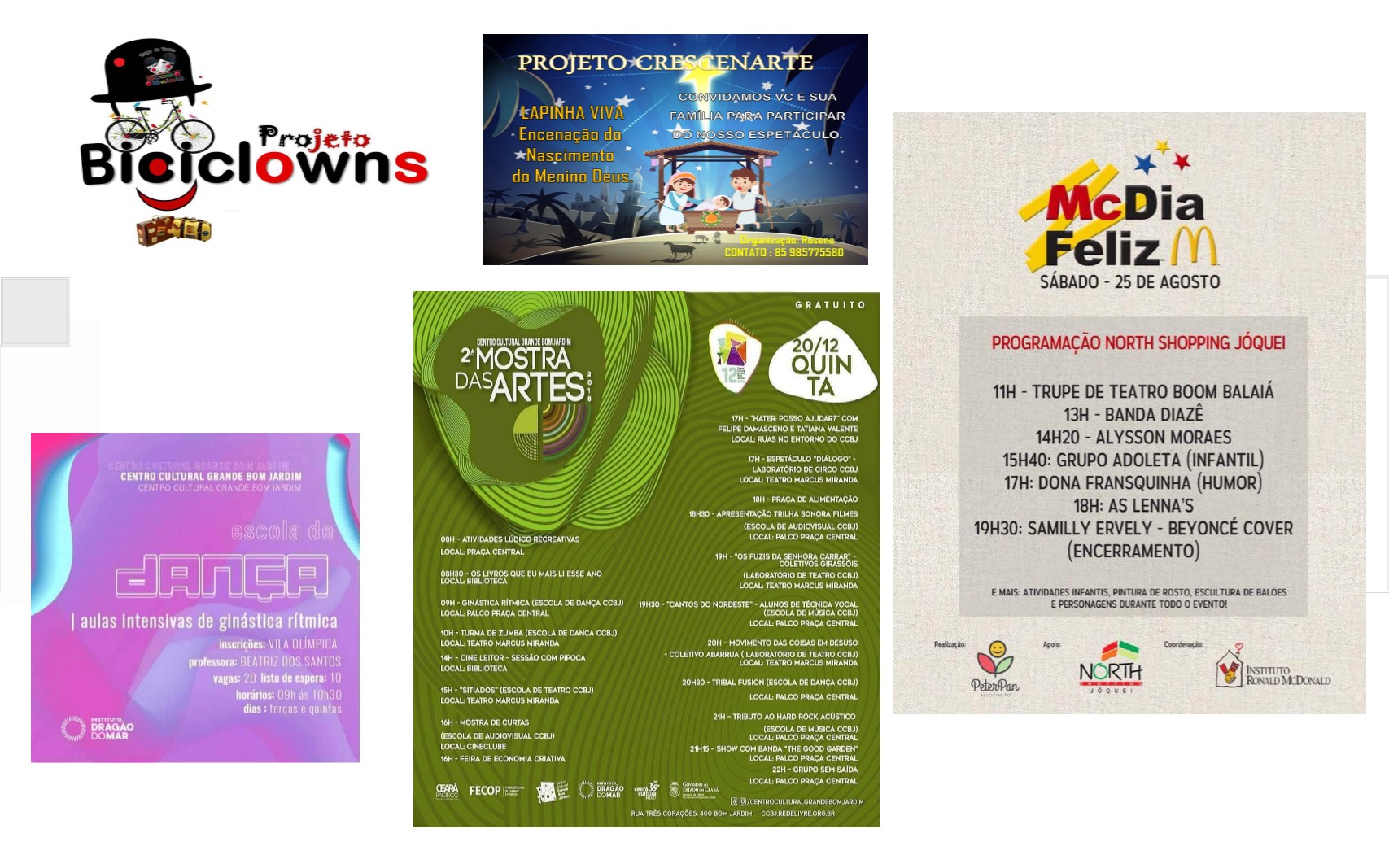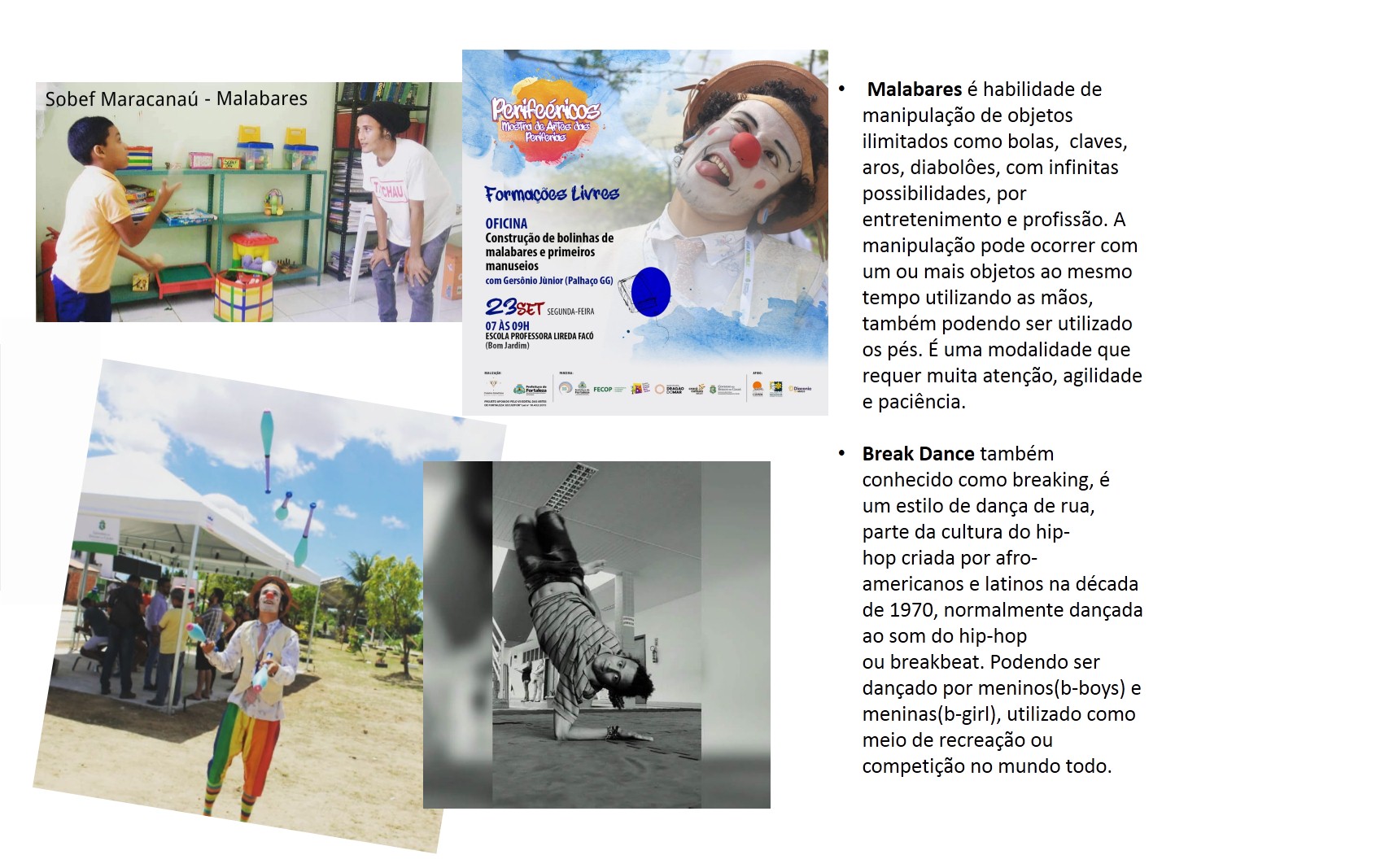Boom Balaia Circo Teatro É um coletivo de Artistas Independentes existentes em nosso território Artístico Circense, Localizado na Região do GBJ – Grande Bom Jardim – Fortaleza. CE. Que tem sua Areia um Celeiro de Cultura, uma região múltiplo cultural, com: Artes Cênicas, Artes Plásticas, Artes Circenses, Musica, Artesanatos, Cultura Digital, Literatura, Patrimônio Cultural e Manifestações Culturais e Populares. Com Sede –Provisório na ACDG. (Endereço: Rua. Sabino Filho – 1110. Siqueira. Fortaleza. CE). O Ciclos das Artes é uma união de inovações e organização de grupos, artistas, produtores, idealizadores e apoiadores no incentivo da Produção Cultural, da Sustentabilidade com a Cultura, com as Diversidades Artísticas, Patrimônio Cultural, Convivência e Vivencias, e Desenvolvimento de Políticas de Cultura em nossa região, com objetivos com a Cultural e a Artes, acesso ao teatro e o circo livre para todos, projetos sociocultural e com o incentivo das práticas de fazer Artes Livre em Nosso Estado. “Já que estamos e estamos aqui, aqui estamos e estamos aí. Apesar dos pesares, estamos vivos”. É parafraseando essa música que anunciamos o retorno do movimento artístico cultural do Siqueira, vamos continuar mantendo vivo o nosso fazer arte e cultura dentro do bairro. Já que ainda não podemos fazer da forma certa que é pra ser feito, ao vivo e presencial, estaremos realizando um “ao vivo” só que pela internet. Reforçar a frase “O espetáculo não pode parar” nunca foi tão necessária, observando esse período de pandemia em que estamos passando. A arte que também cura através dos risos causados pelo contato direto, tentaremos proporcionar pela rede social, por conta do distanciamento social(quase um pleonasmo).APRESENTAÇÃO DE ESPETÁCULOS
