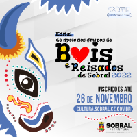 O Município de Sobral-CE, por intermédio da Secretaria Municipal da Cultura e Turismo - SECULT, inscrita no CNPJ sob o nº 07.598.634/0001-37, torna pública a realização da CHAMADA PÚBLICA PARA APOIO E INCENTIVO DA TRADIÇÃO DE GRUPOS DE BOIS E REISADOS DE SOBRAL, cujo objetivo é apoiar grupos que irão se apresentar durante as atividades do ciclo festivo de Bois e Reisados no ano de 2022, em conformidade com o artigo 2º da Lei Municipal n°1.244/2013.