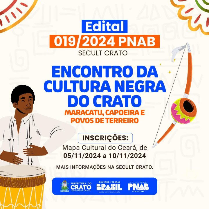 EDITAL DE CHAMAMENTO PÚBLICO 019/2024 PNAB CRATO [ENCONTRO DA CULTURA NEGRA DO CRATO- MARACATU, CAPOEIRA E POVOS DE TERREIRO]