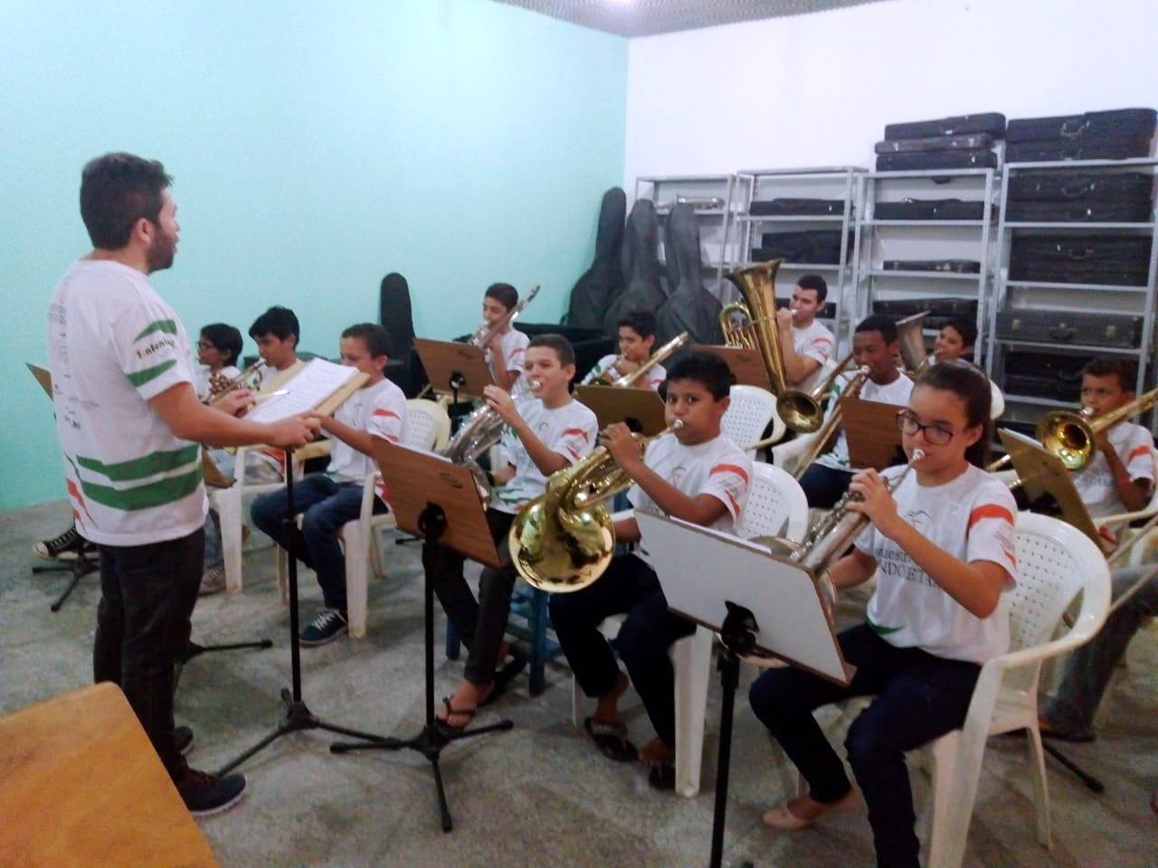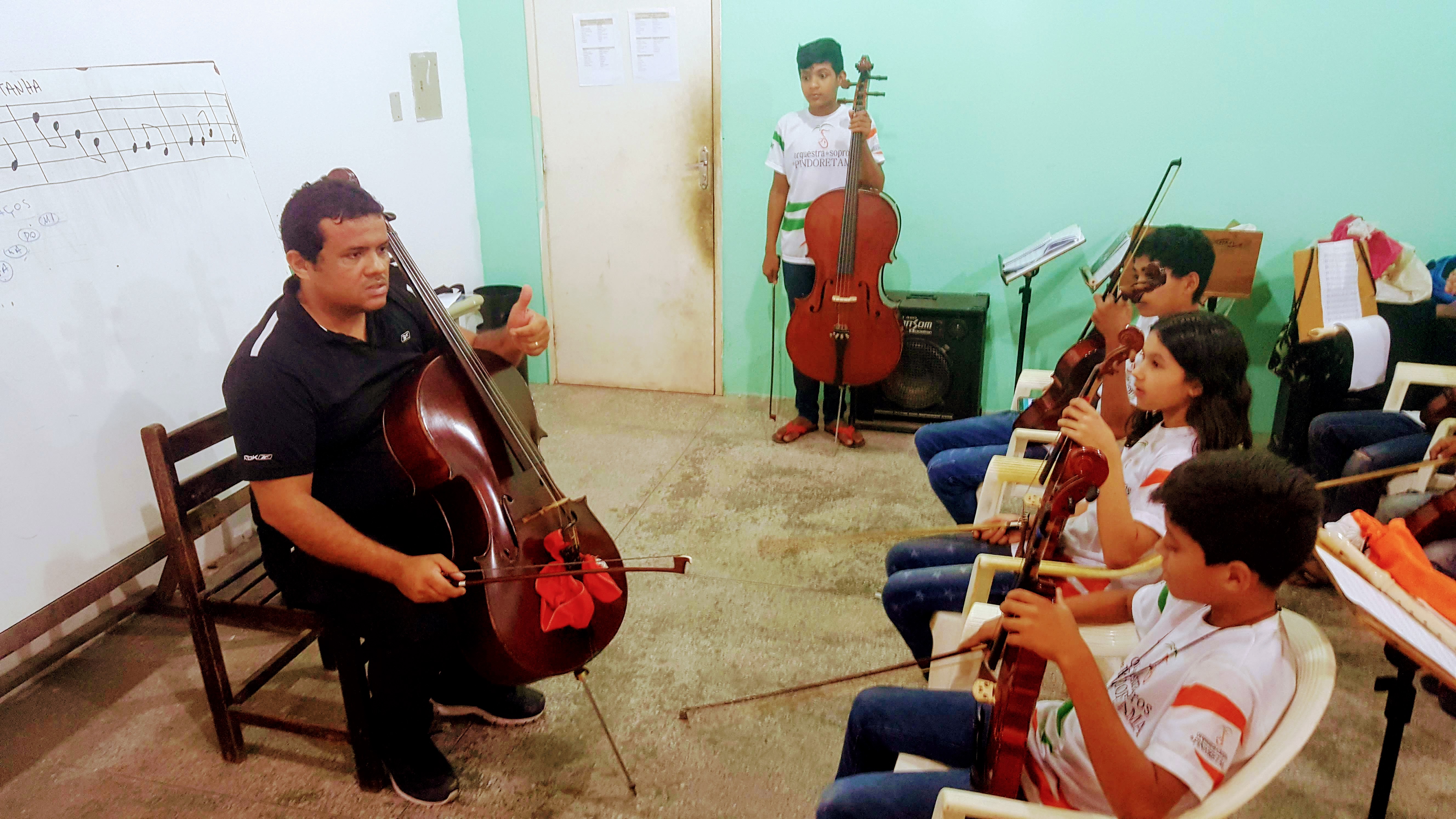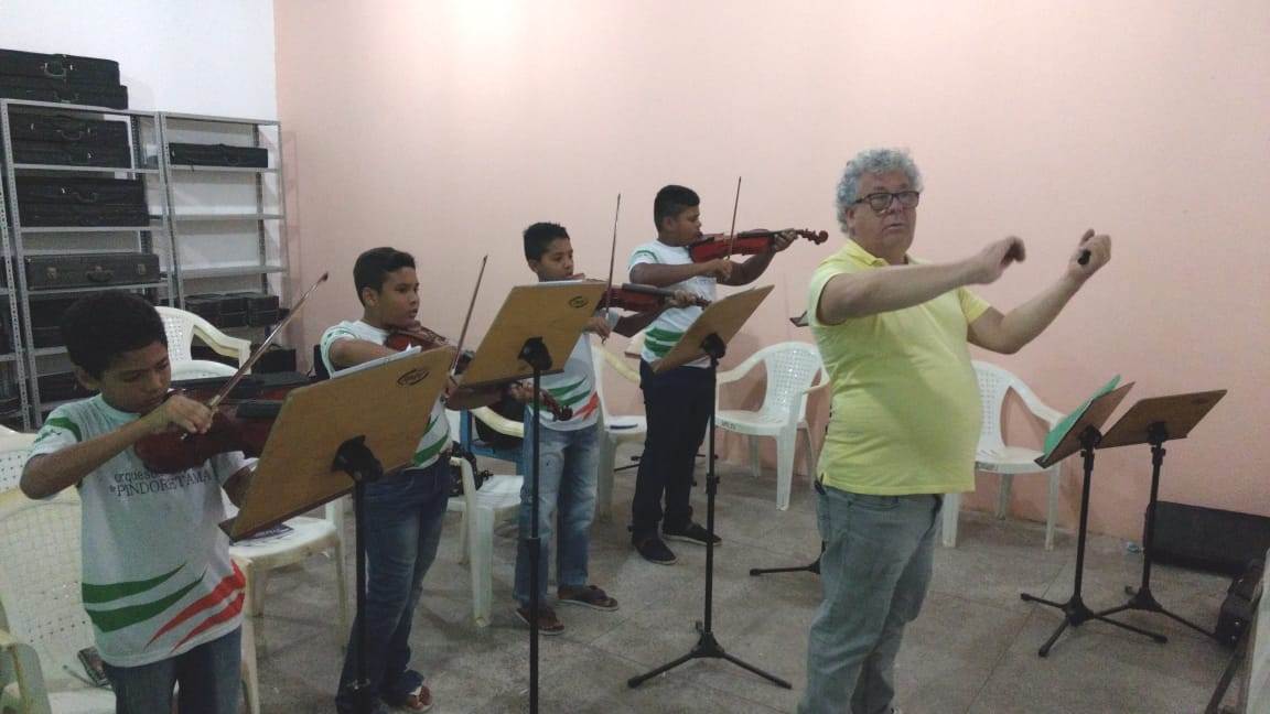 Através do projeto Escola de Música de Pindoretama, o Ponto de Cultura Amigos da Arte amplia as ações formativas da Orquestra de Sopros de Pindoretama e passa a oferecer também formação musical em instrumentos de cordas friccionadas como violino, viola, violoncelo e contrabaixo.